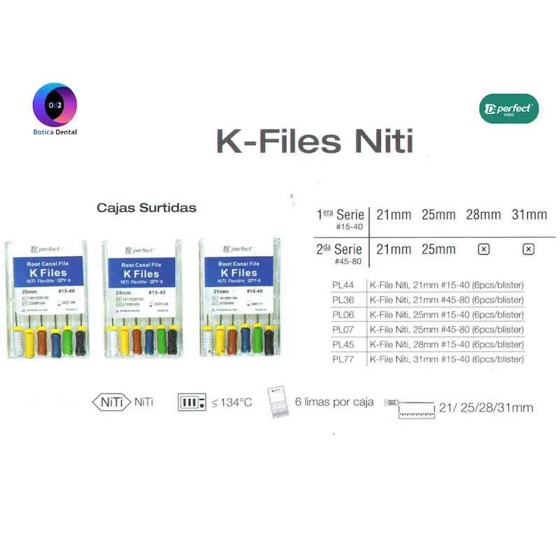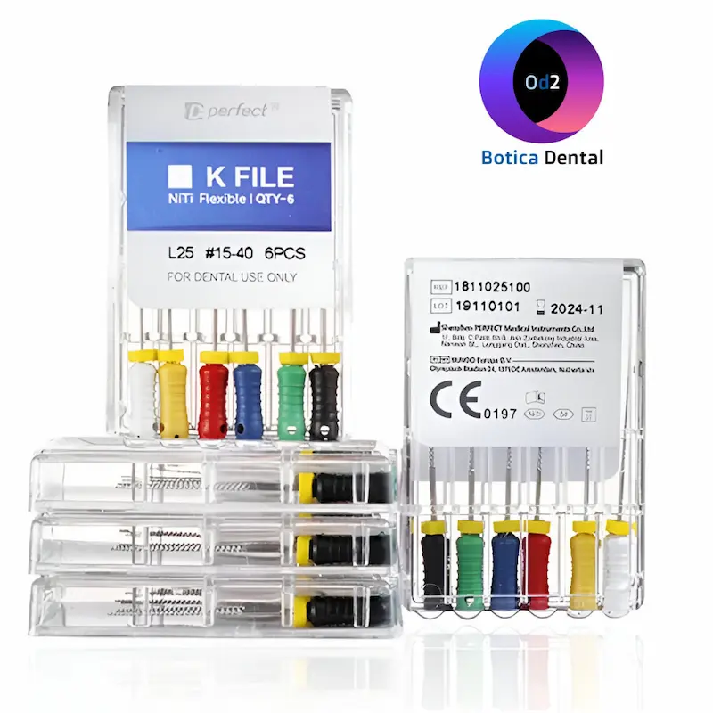 - K-Files NITI (limas manuales flexibles) – D-PERFECT son limas endodónticas manuales fabricadas en aleación de níquel-titanio. Ofrecen una flexibilidad óptima para trabajar en conductos radiculares curvos, reduciendo el riesgo de transporte del canal o fractura. Con longitudes variadas y dos series distintas, proporcionan al profesional una amplia capacidad de adaptación durante los procedimientos. Cada lima cuenta con codificación por colores para facilitar su identificación.