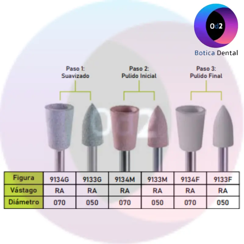 | Especificaciones: | -Tipo de kit: Pulidores de silicona para restauraciones dentales -Fases de uso: Pre-pulido, alisado, y brillo final -Materiales compatibles: Resinas compuestas, cerámicas, metales -Rotación recomendada: 5,000–12,000 rpm -Aplicación: Clínica y laboratorio -Formato de uso: Contra-ángulo -Sterilización: Autoclavable a 134 °C -Diseño: Compacto y organizado -Presentación: Kit con entre 9 y 12 pulidores según configuración -Color de identificación: Codificados por grano para fácil selección |