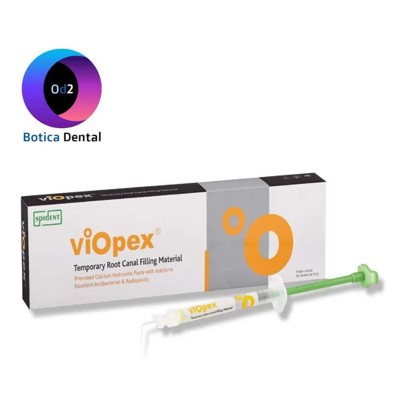• El VioPex (Pasta Premezclada) – SPIDENT es una pasta endodóntica premezclada con hidróxido de calcio y yodoformo, ideal para tratamientos de apexificación y reabsorción radicular. Su pH alcalino favorece la reparación ósea y su alta radioopacidad permite un control radiográfico preciso.